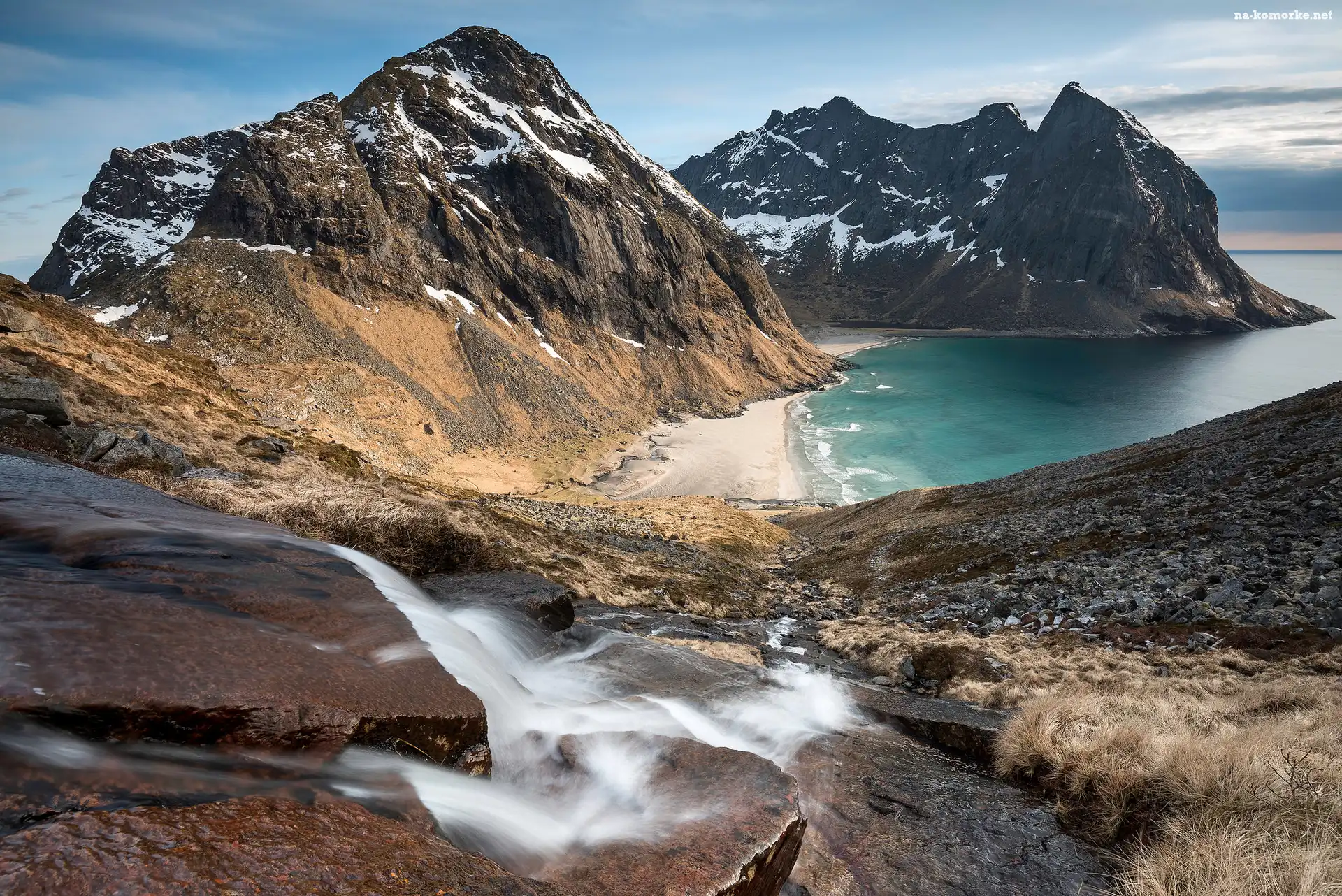 Morze, Norwegia, Lofoty, Góry, Plaża Kvalvika na Komórkę