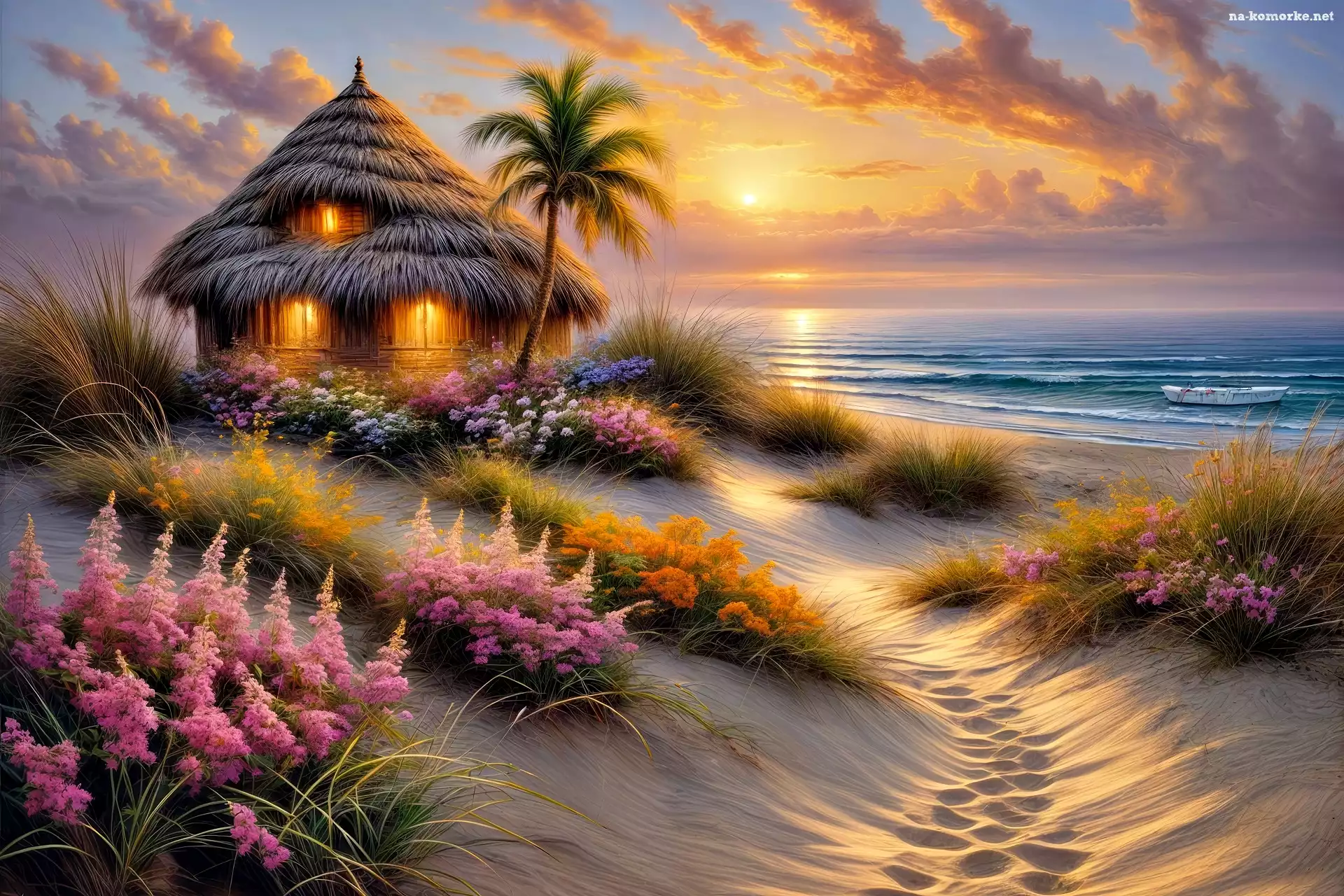 Zachód słońca, Plaża, Morze, Grafika, Chata, Kwiaty na Komórkę