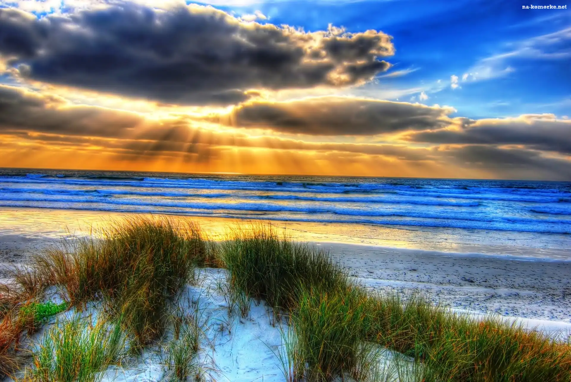 Morze, Trawa, Plaża, Chmury na Komórkę