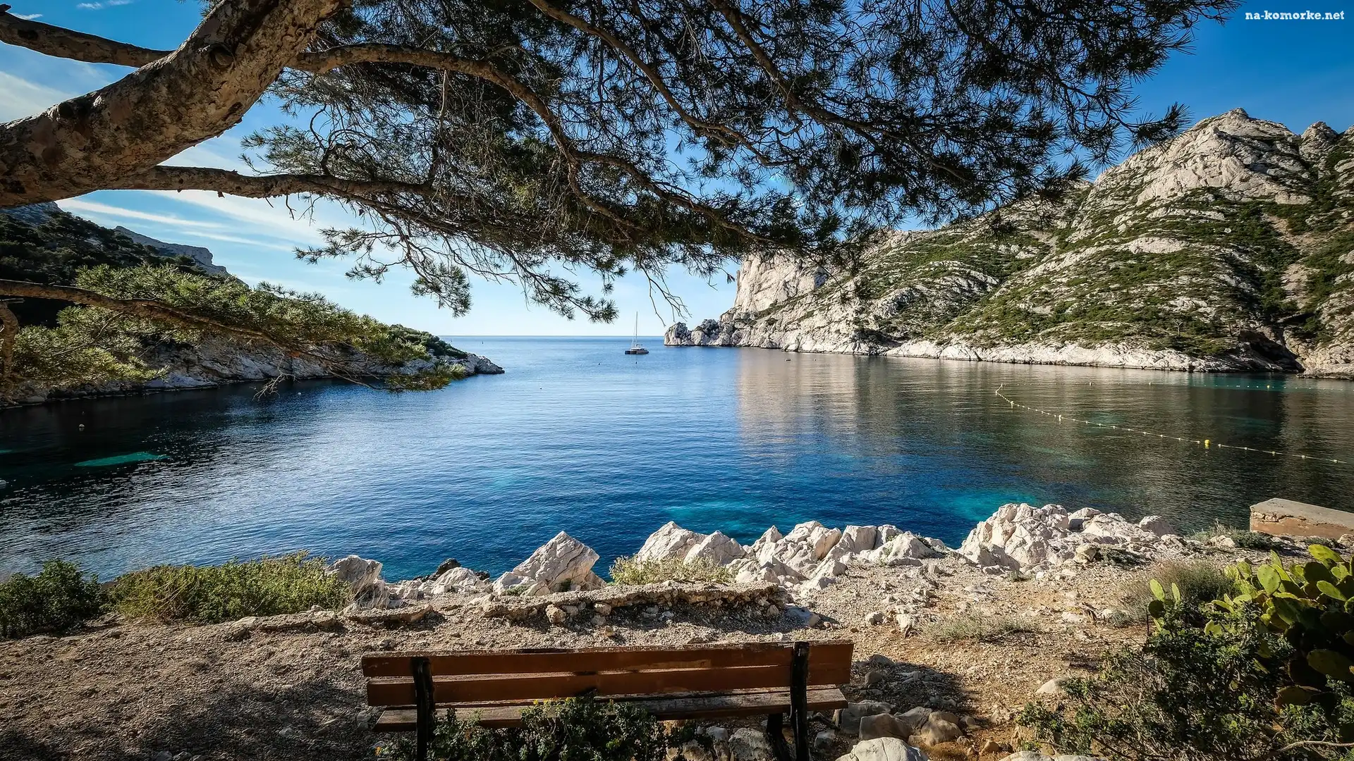 Morze, Drzewo, Skały, Ławeczka na Komórkę