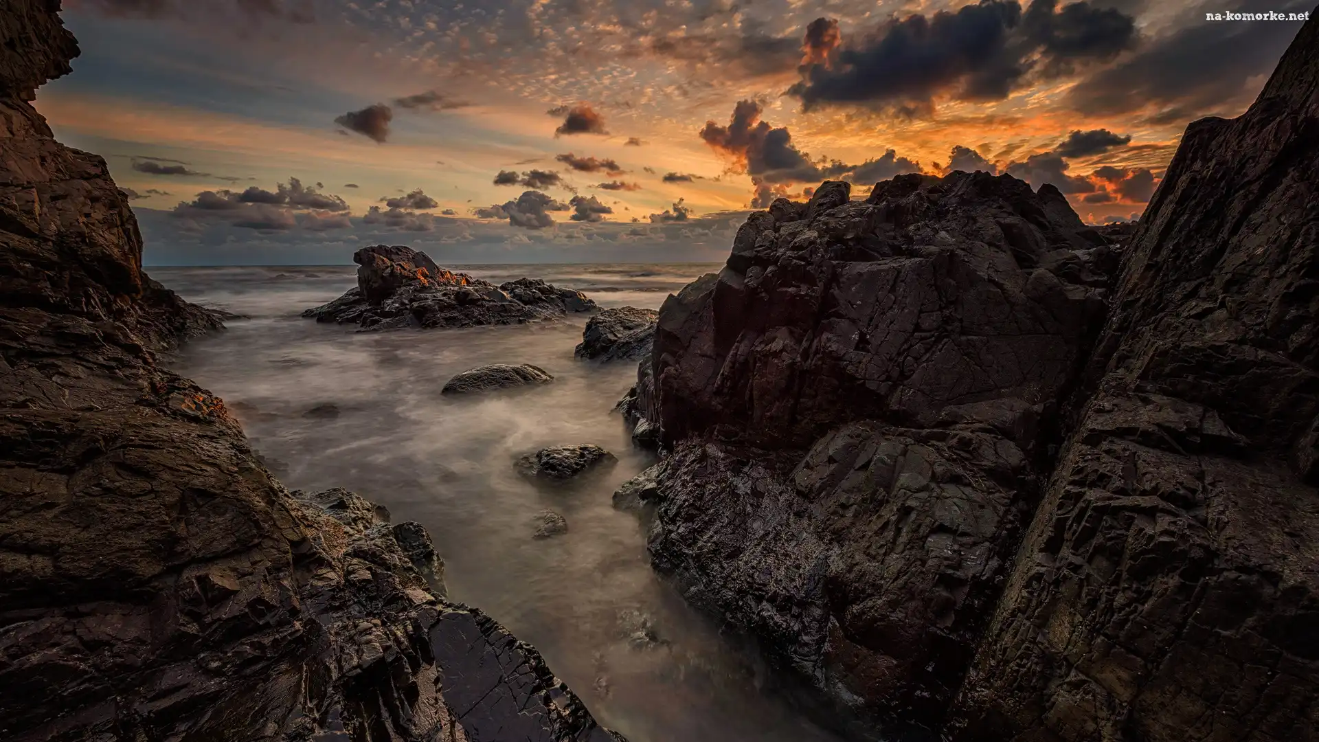 Morze, Zachód słońca, Skały, Chmury na Komórkę