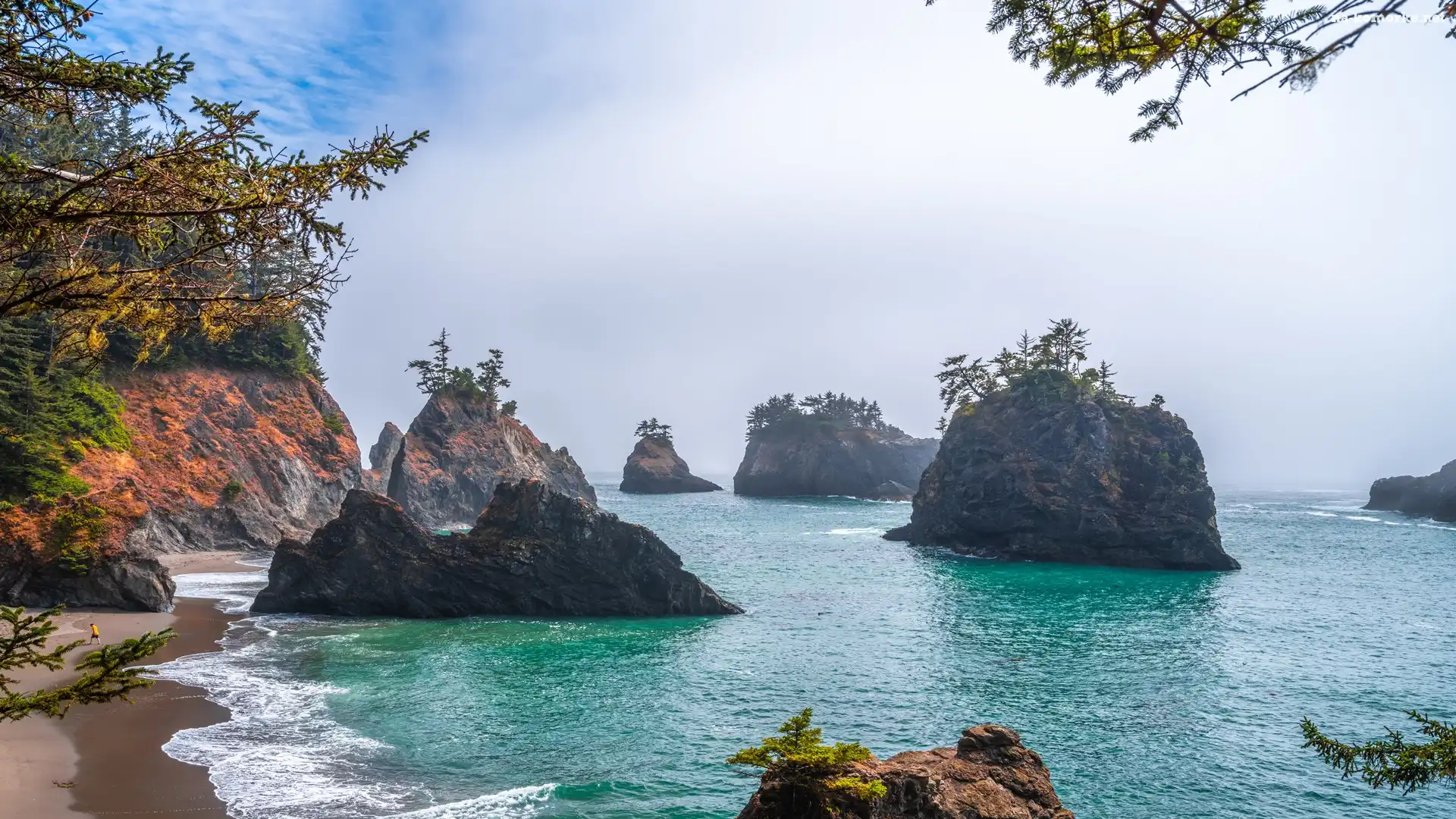 Skały, Oregon, Stany Zjednoczone, Morze, Drzewa, Park stanowy, Samuel H Boardman State Scenic Corridor na Komórkę |