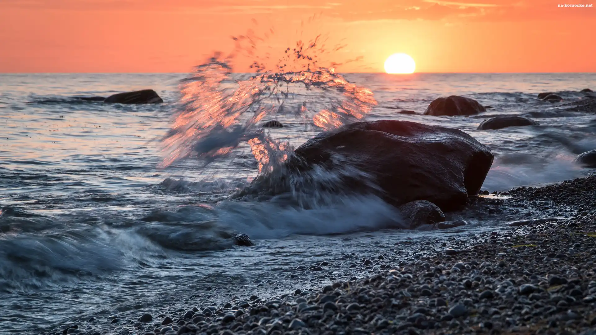 Morze, Fale, Wschód Słońca, Kamienie na Komórkę
