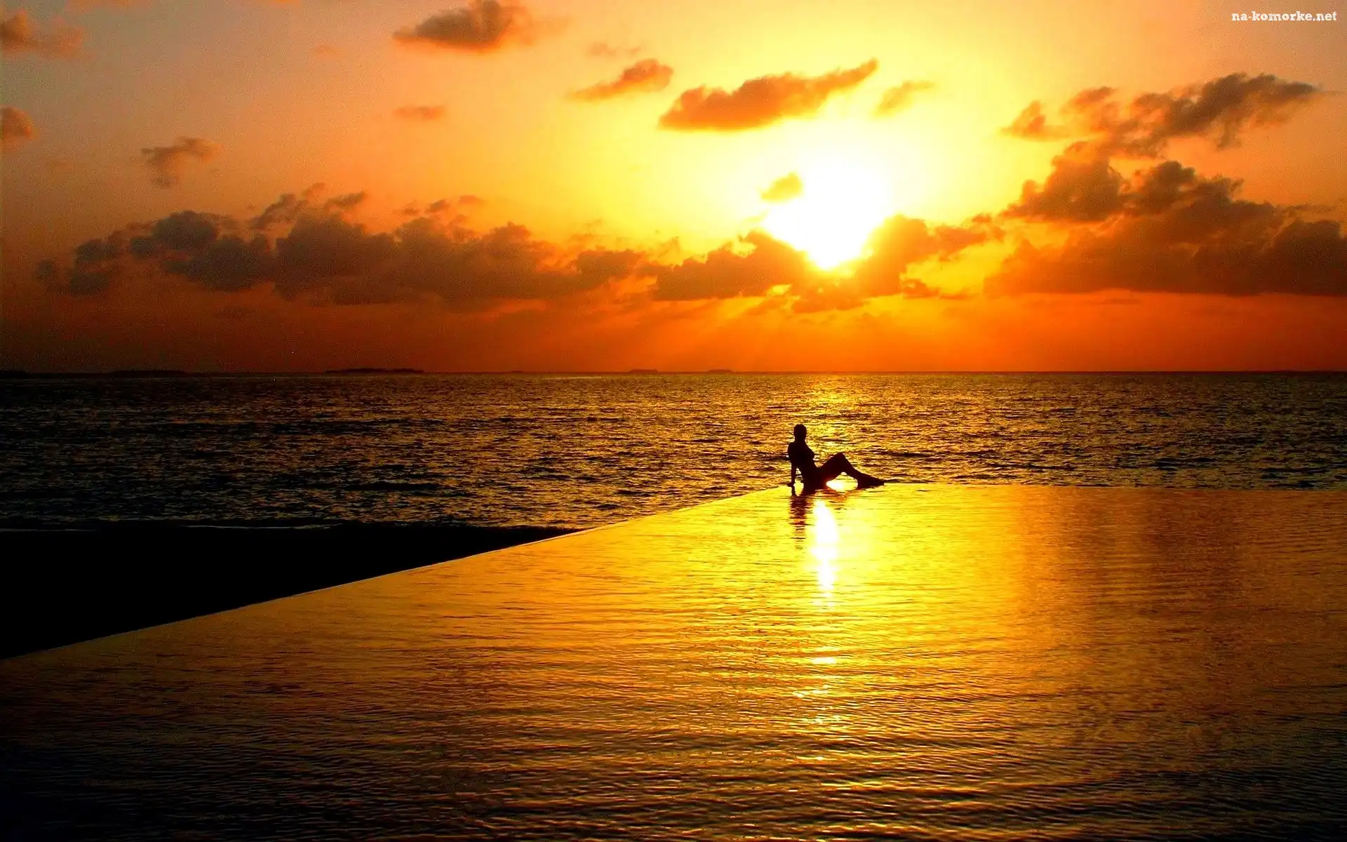 Morze, Zachód Słońca, Kobieta na Komórkę