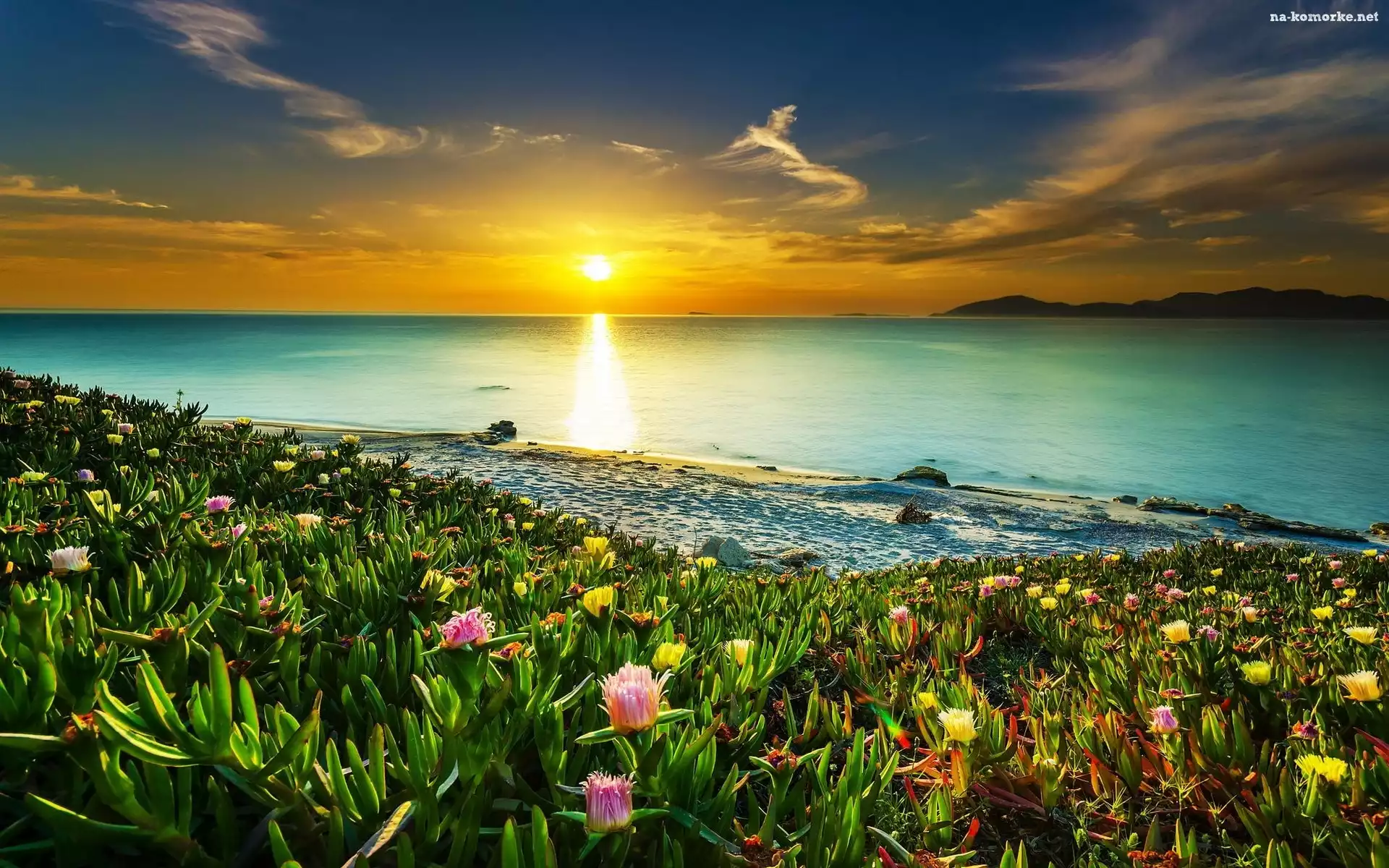 Morze, Kwiaty, Zachód słońca, Plaża na Komórkę