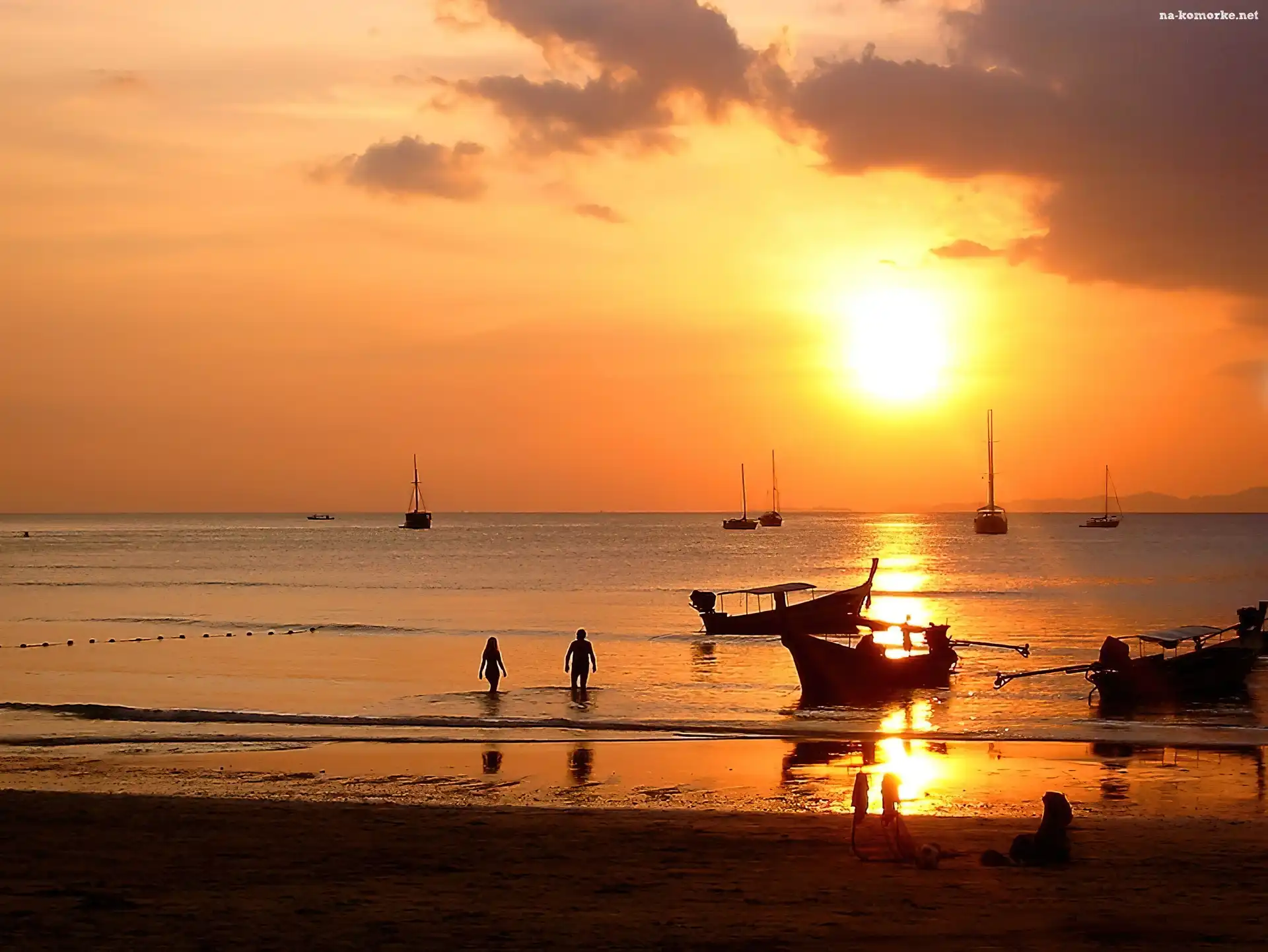 Morze, Łódki, Zachód Słońca, Widoczek na Komórkę