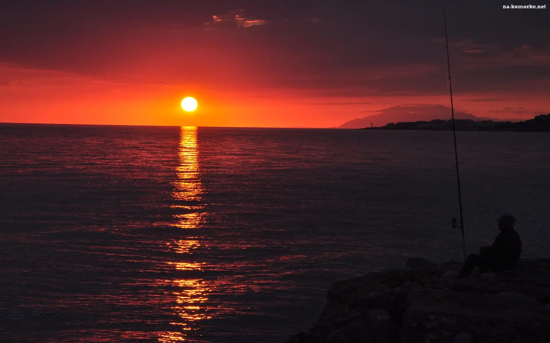 Morze, Zachód Słońca, Wędkarz na Komórkę