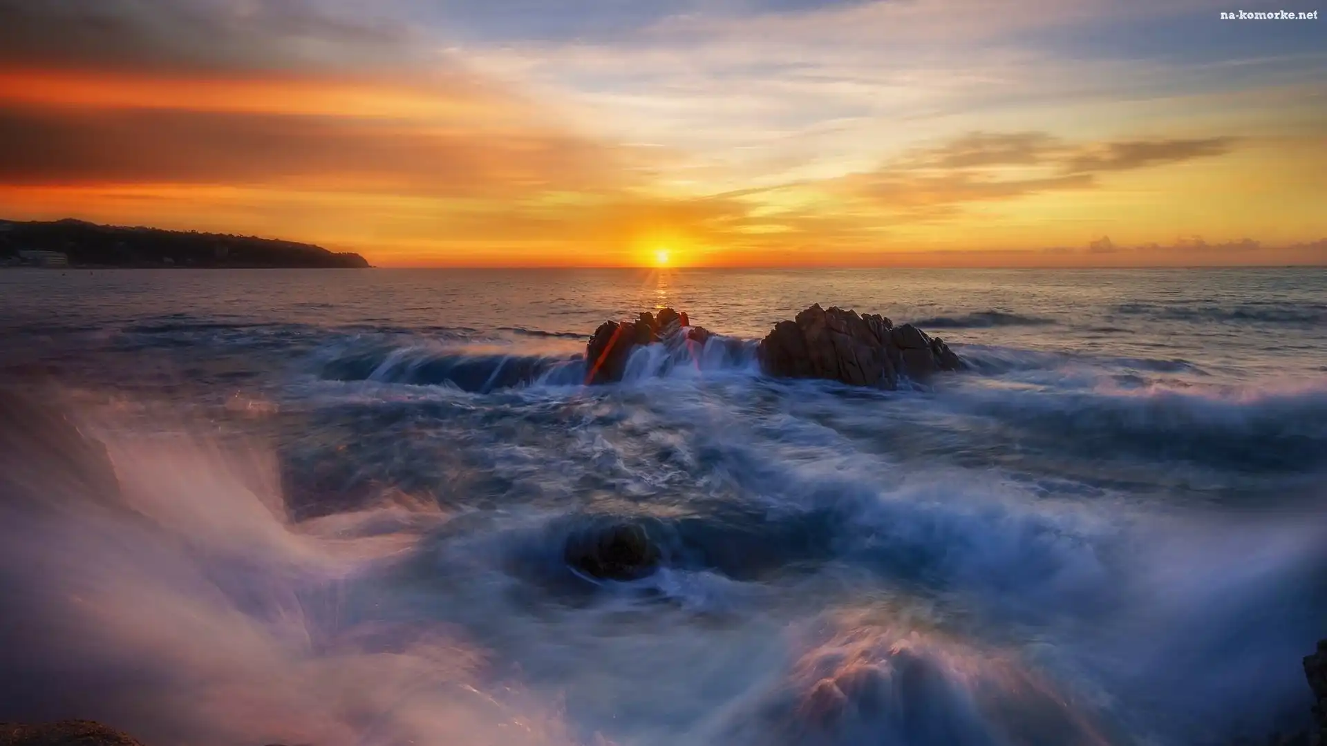 Morze, Fale, Skały, Zachód słońca na Komórkę