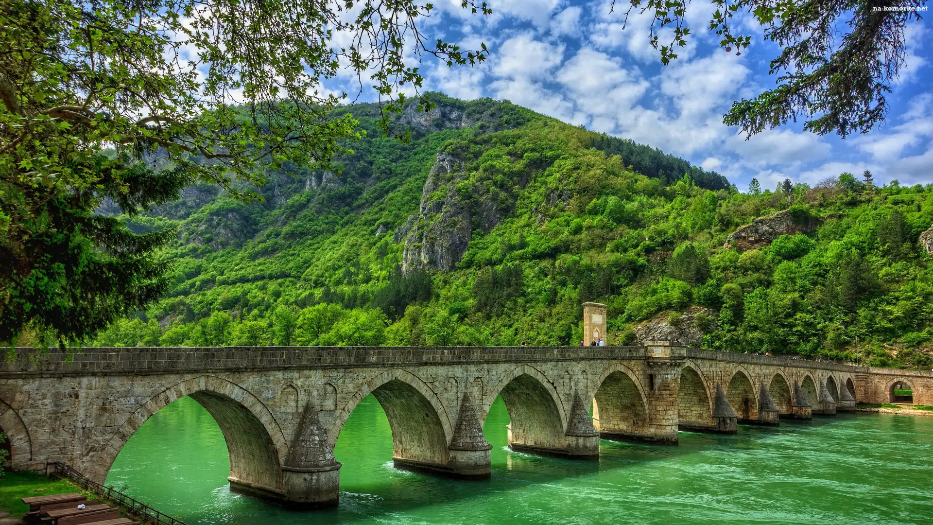 Most łukowy, Visegrad, Bośnia i Hercegowina, Mehmeda Paszy Sokolovicia, Rzeka Drina, Góry, Drzewa na Komórkę |