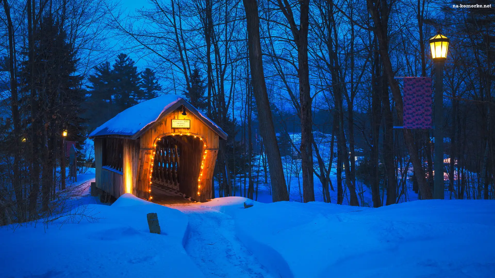Most, Przejście, Stany Zjednoczone, Oświetlone, Stan New Hampshire, Gilford, Tannery Hill Covered Bridge, Zima, Latarnie, Drzewa na Komórkę |