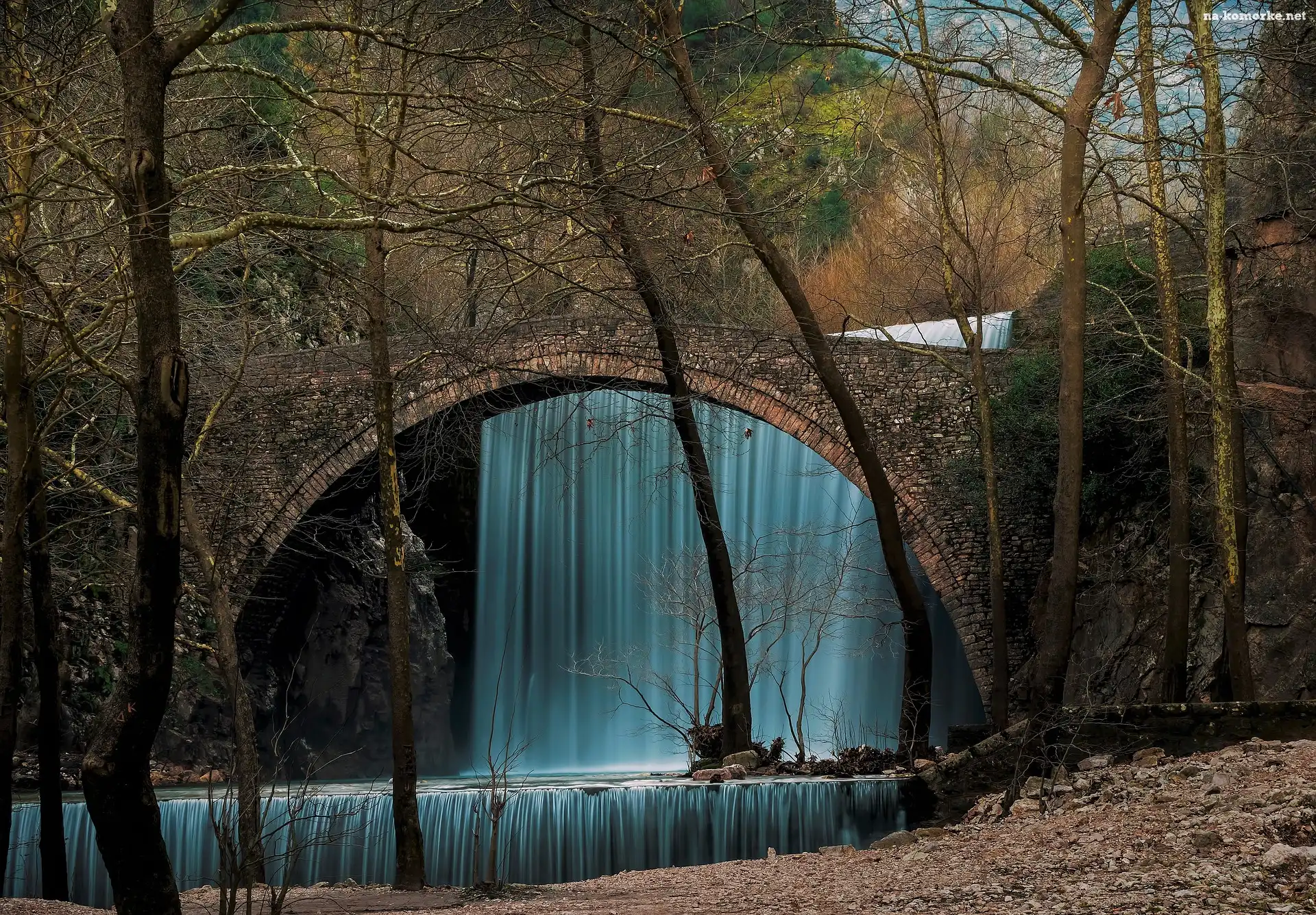 Wodospad, Trikala, Drzewa, Grecja, Palaiokarya waterfalls, Rzeka Pinios, Kamienny, Most na Komórkę