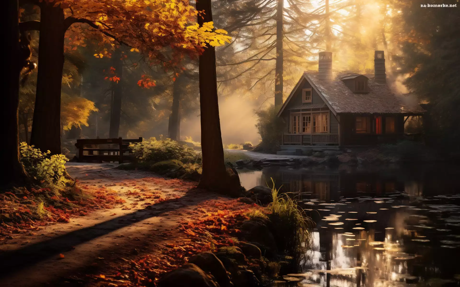 Most, Mgła, Słoneczny blask, Dom, Liście, Drzewa, Jesień, Ścieżka, Staw na Komórkę