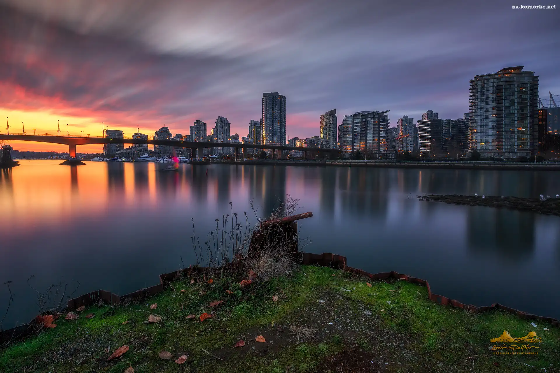Kanada, Zachód słońca, Chmury, Vancouver, Prowincja Kolumbia Brytyjska, Wieżowce, Most na Komórkę