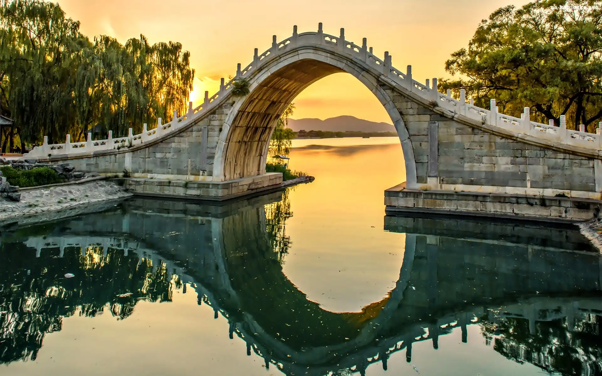 Most, Drzewa, Rzeka, Zachód Słońca na Komórkę