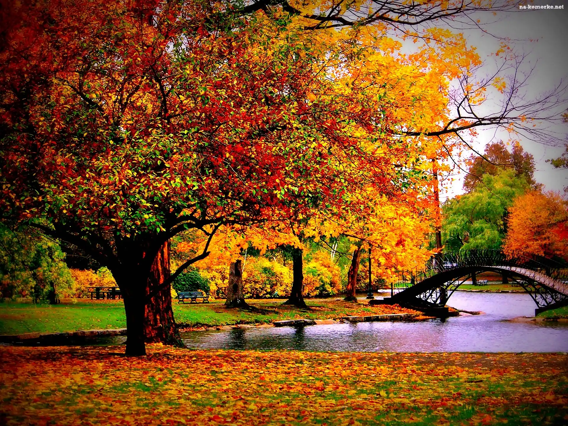 Mostek, Park, Jesień, Liście, Staw, Opadłe na Komórkę