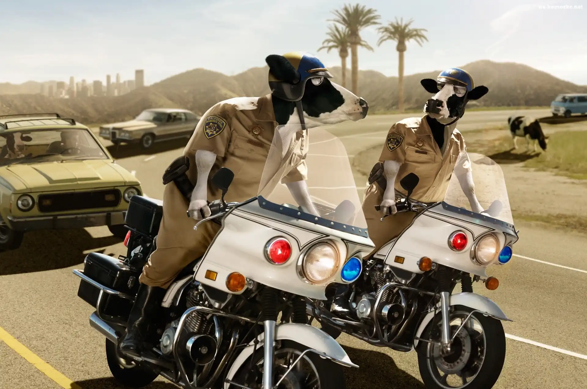 Motory, Droga, Samochody, Krowy, Policja na Komórkę