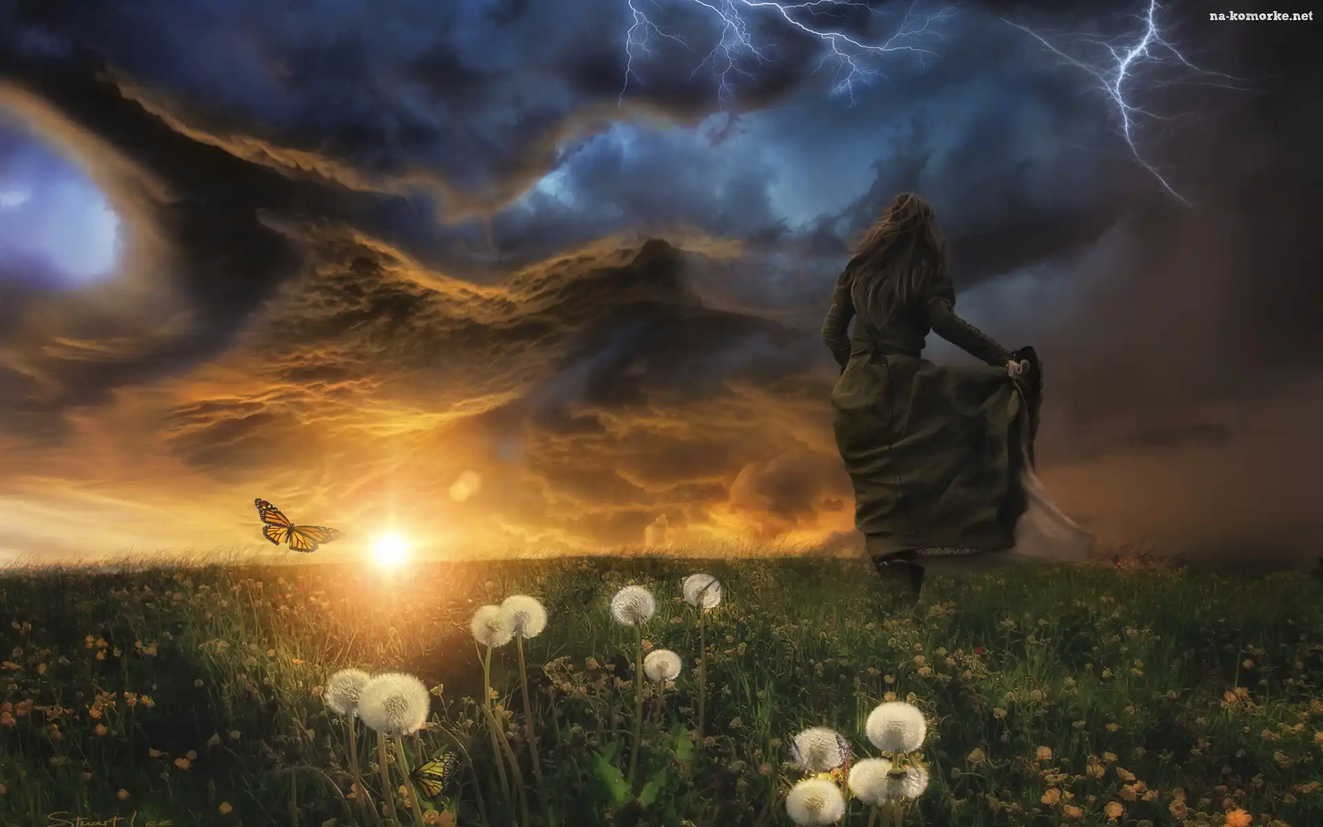 Motyl, Łąka, Burza, Fantasy, Dmuchawce, Kobieta na Komórkę
