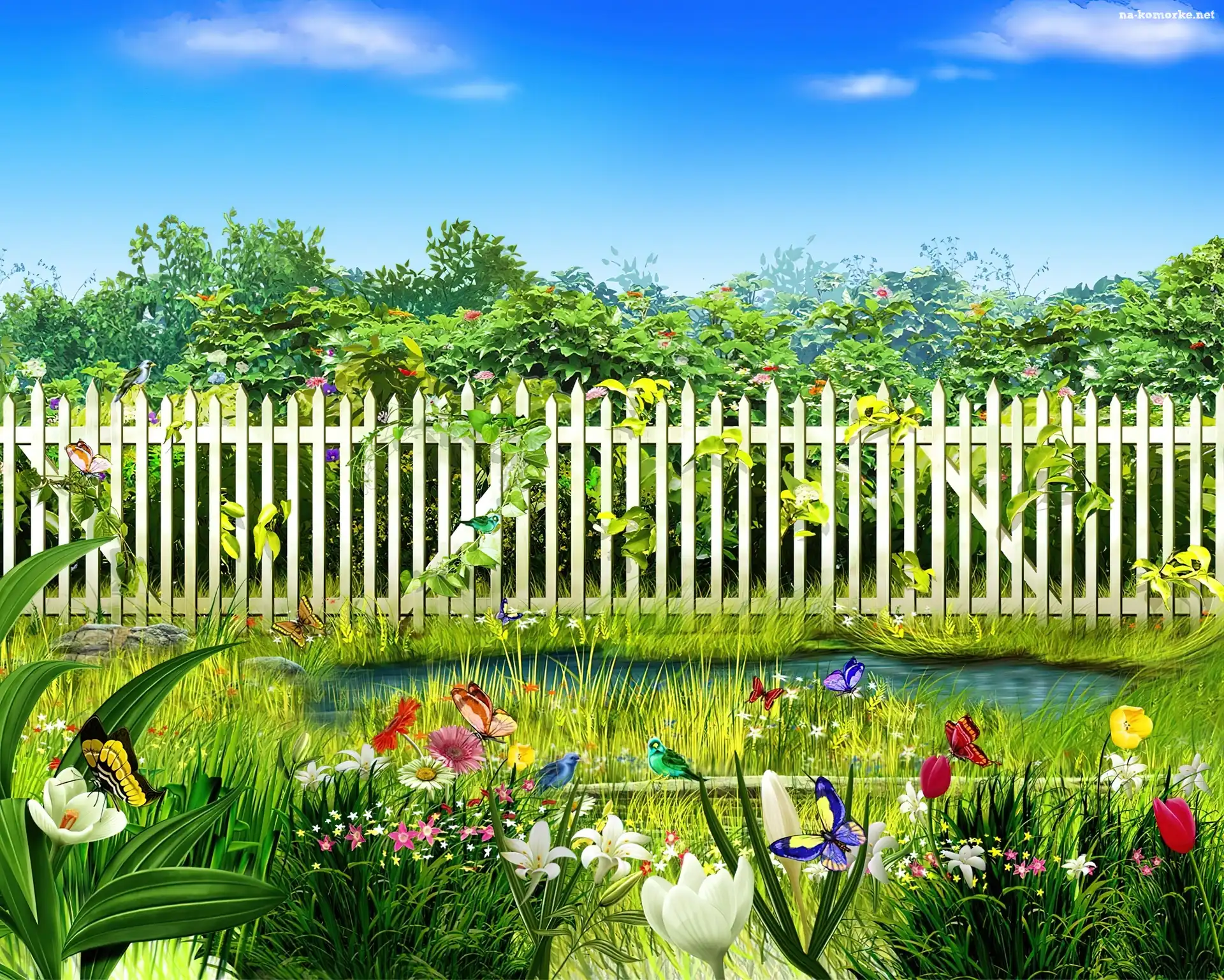 Motyle, Kwiaty, Ogród, Płot, Bajorko, Ptaki na Komórkę