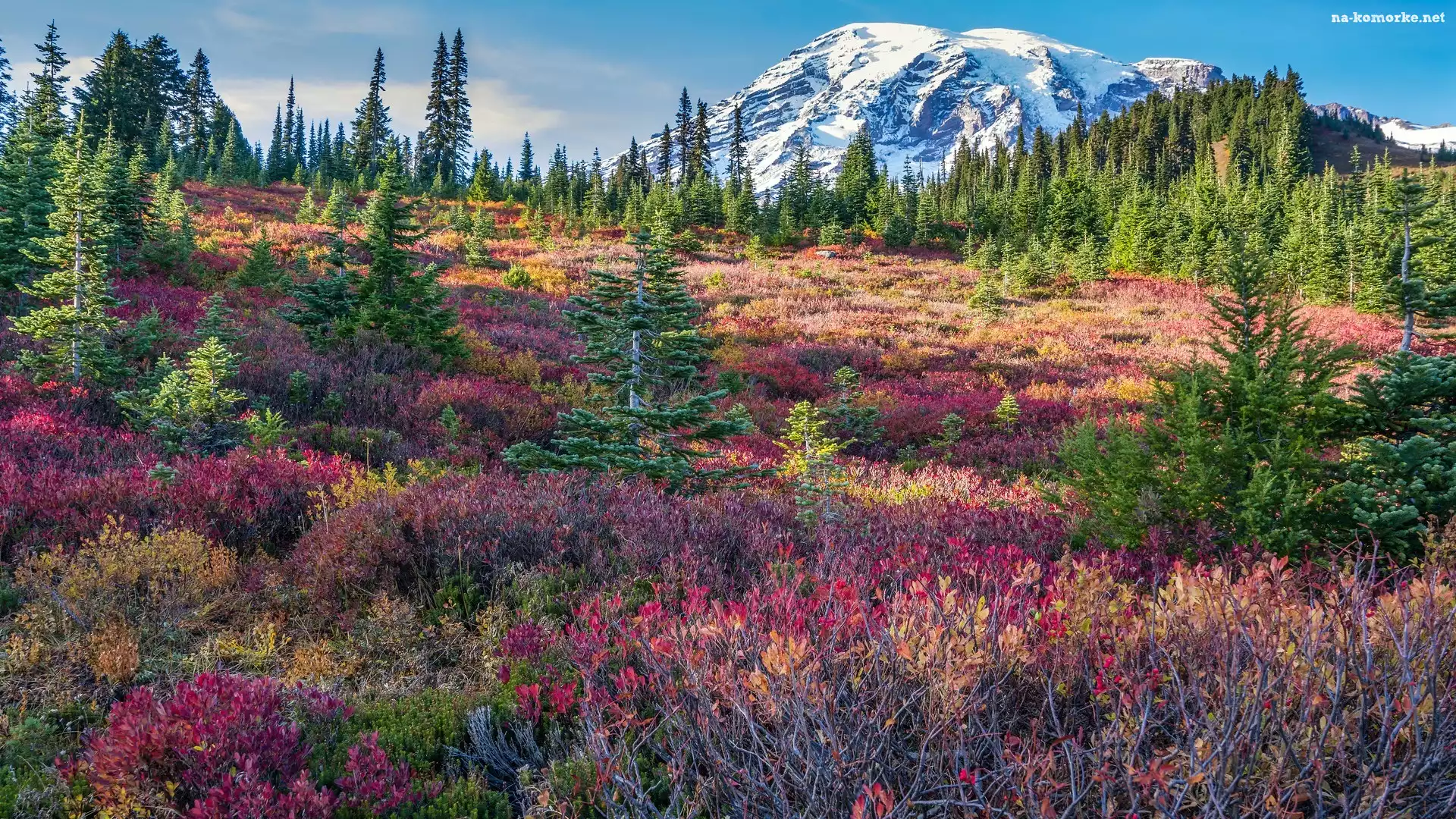Drzewa, Park Narodowy Mount Rainier, Stratowulkan, Mount Rainier, Rośliny, Waszyngton, Stany Zjednoczone, Łąka, Góry, Chmury, Kolorowe na Komórkę |