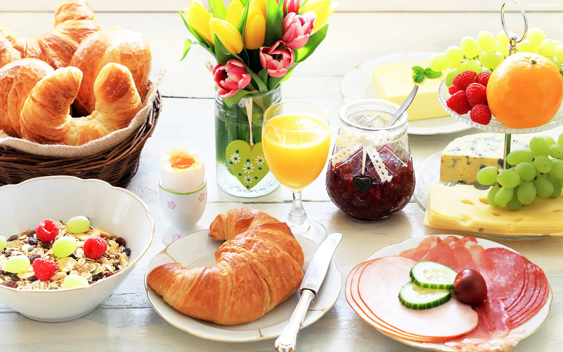 Musli, Rogale, Śniadanie, Tulipany, Wędliny, Kwiaty na Komórkę