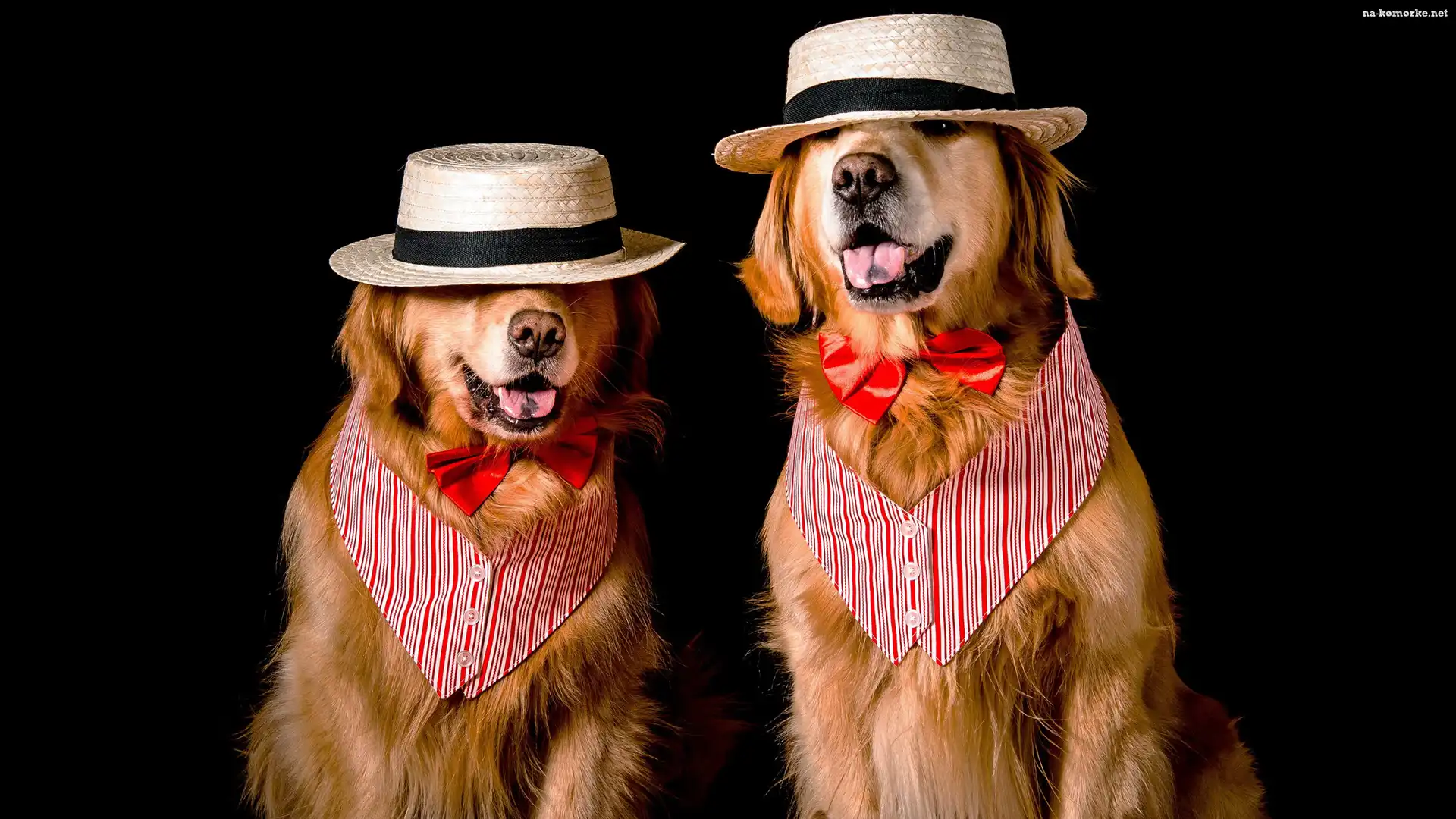 Muszki, Dwa, Psy, Golden retriever, Kapelusze na Komórkę