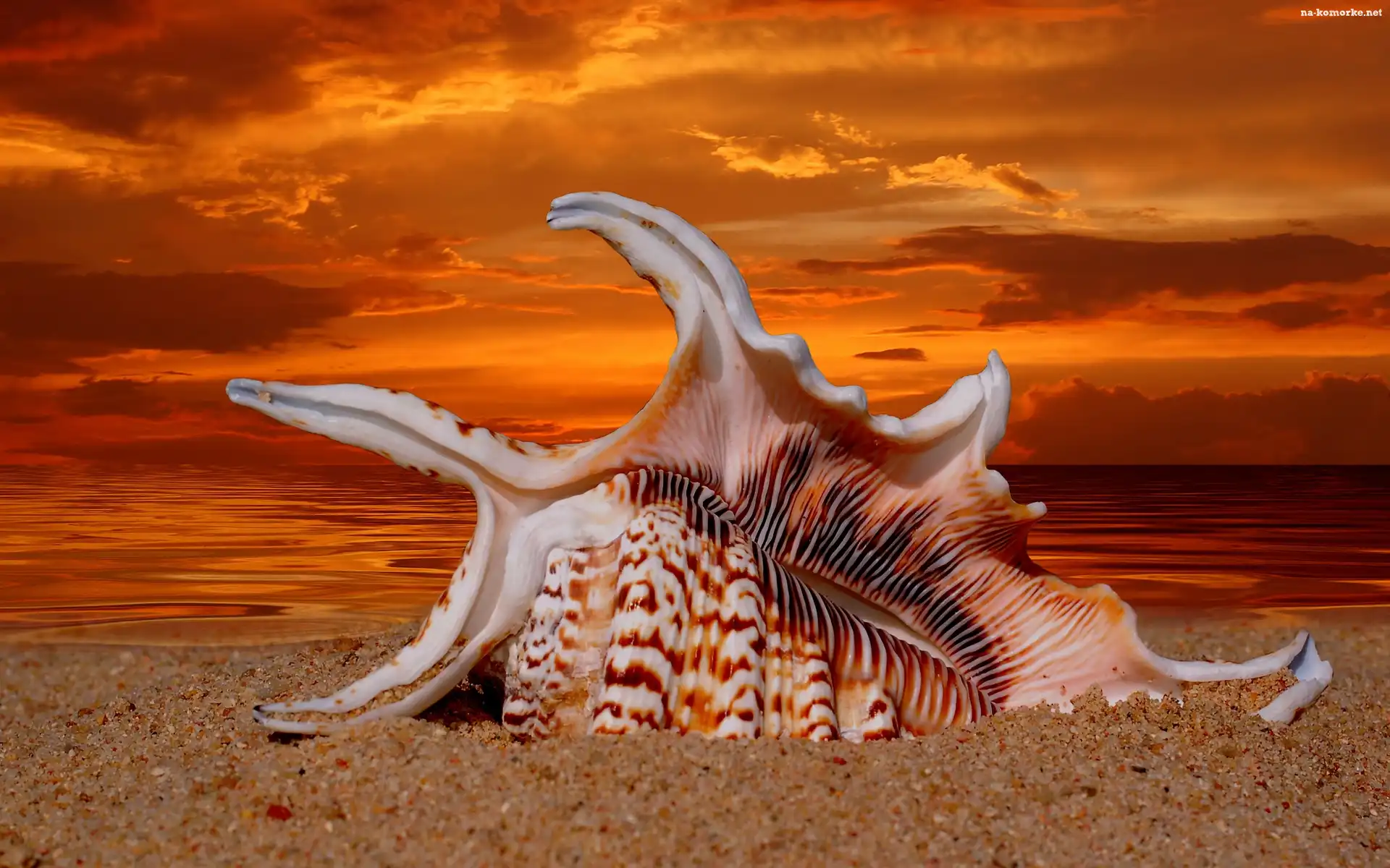 Muszla, Słońca, Plaża, Zachód na Komórkę