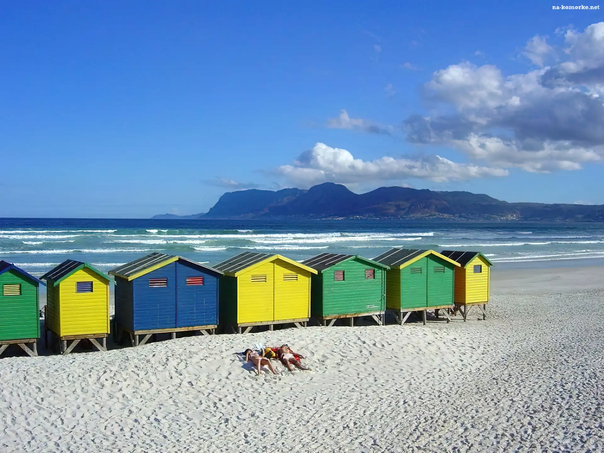domki na plaży, Góry, Plaża, Fale, Morze na Komórkę