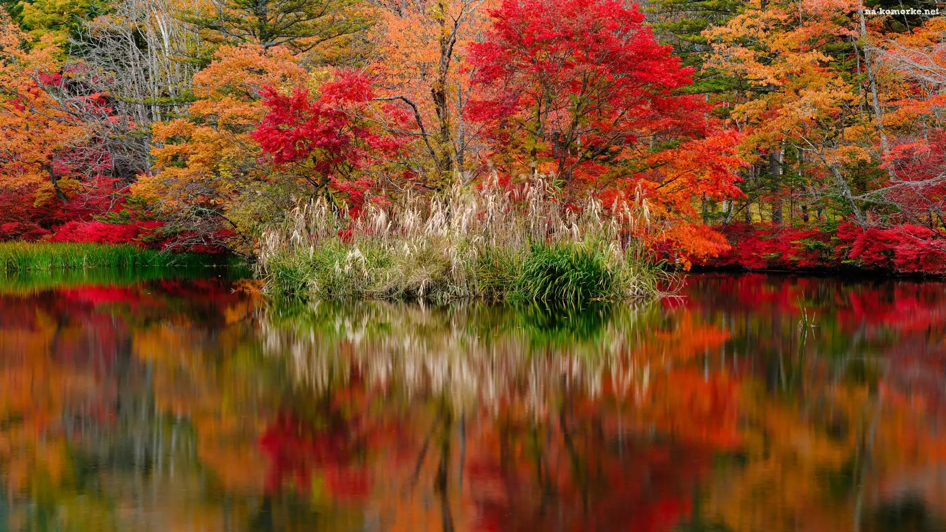 Trawy, Kumoba Pond, Kolorowe, Drzewa, Karuizawa, Staw, Jesień, Kępy, Nagano, Japonia, Odbicie na Komórkę |