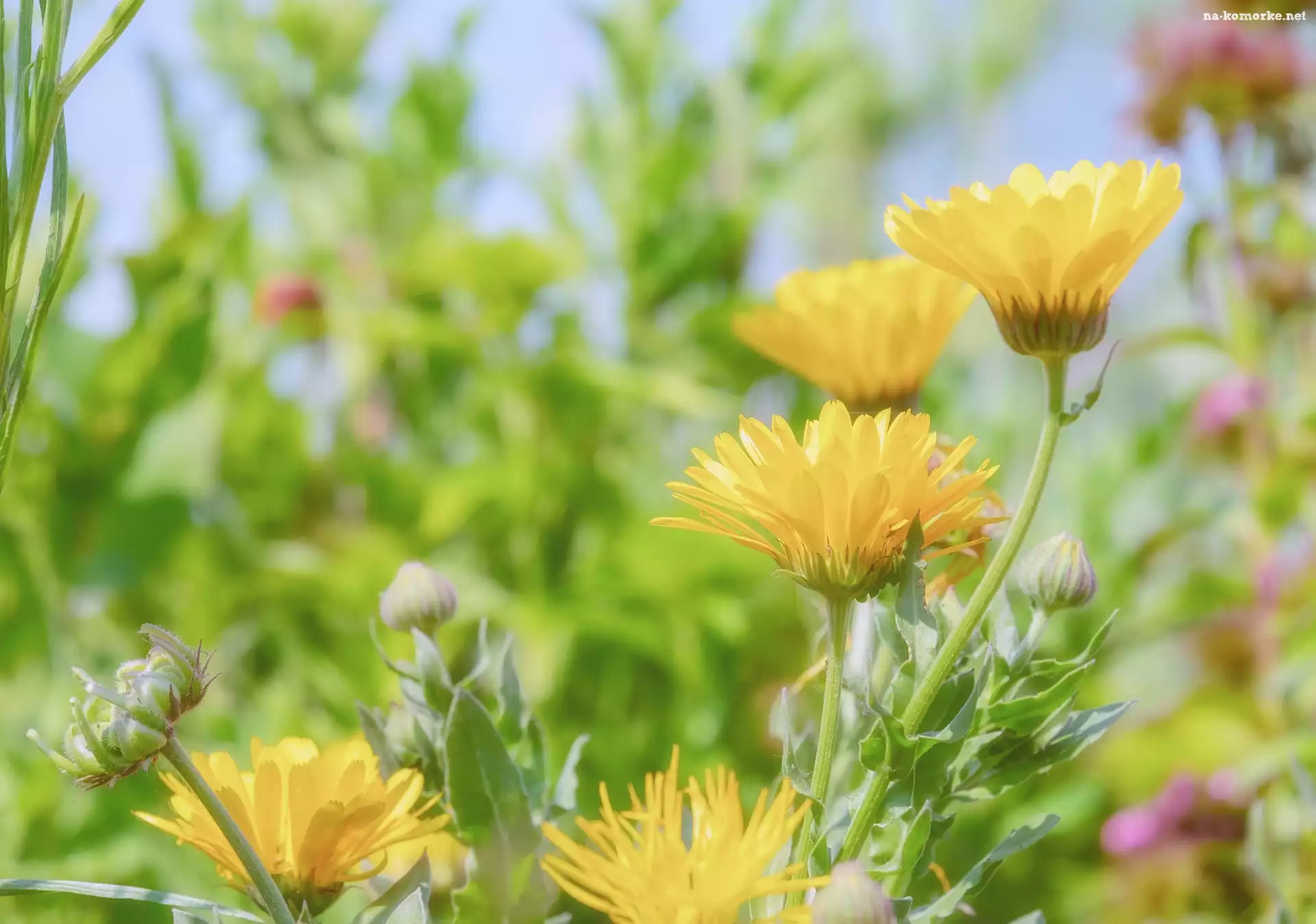 Żółte, Rozmyte tło, Nagietki, Pąki na Komórkę