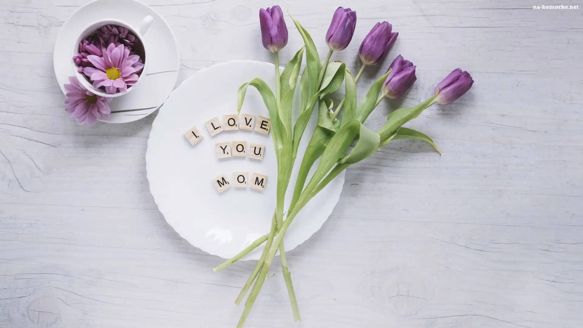 Dzień Maki, Filiżanka, Fioletowe, Margerytki, Bukiet, Tulipany, Talerzyk, Napis na Komórkę