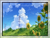 Napowietrzna, Niebo, Kwiaty, Budowla, Słoneczniki, Chmury, Słupy, Linia elektroenergetyczna na Komórkę |