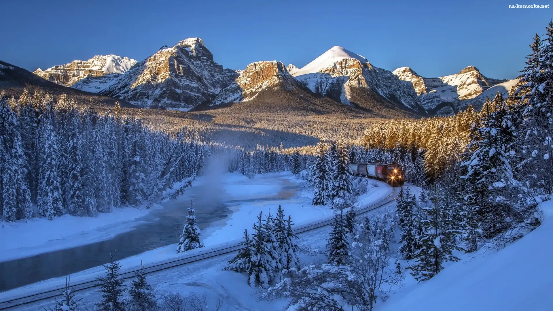 Zima, Park Narodowy Banff, Lasy, Rzeka, Góry, Pociąg, Kanada, Góry Skaliste na Komórkę