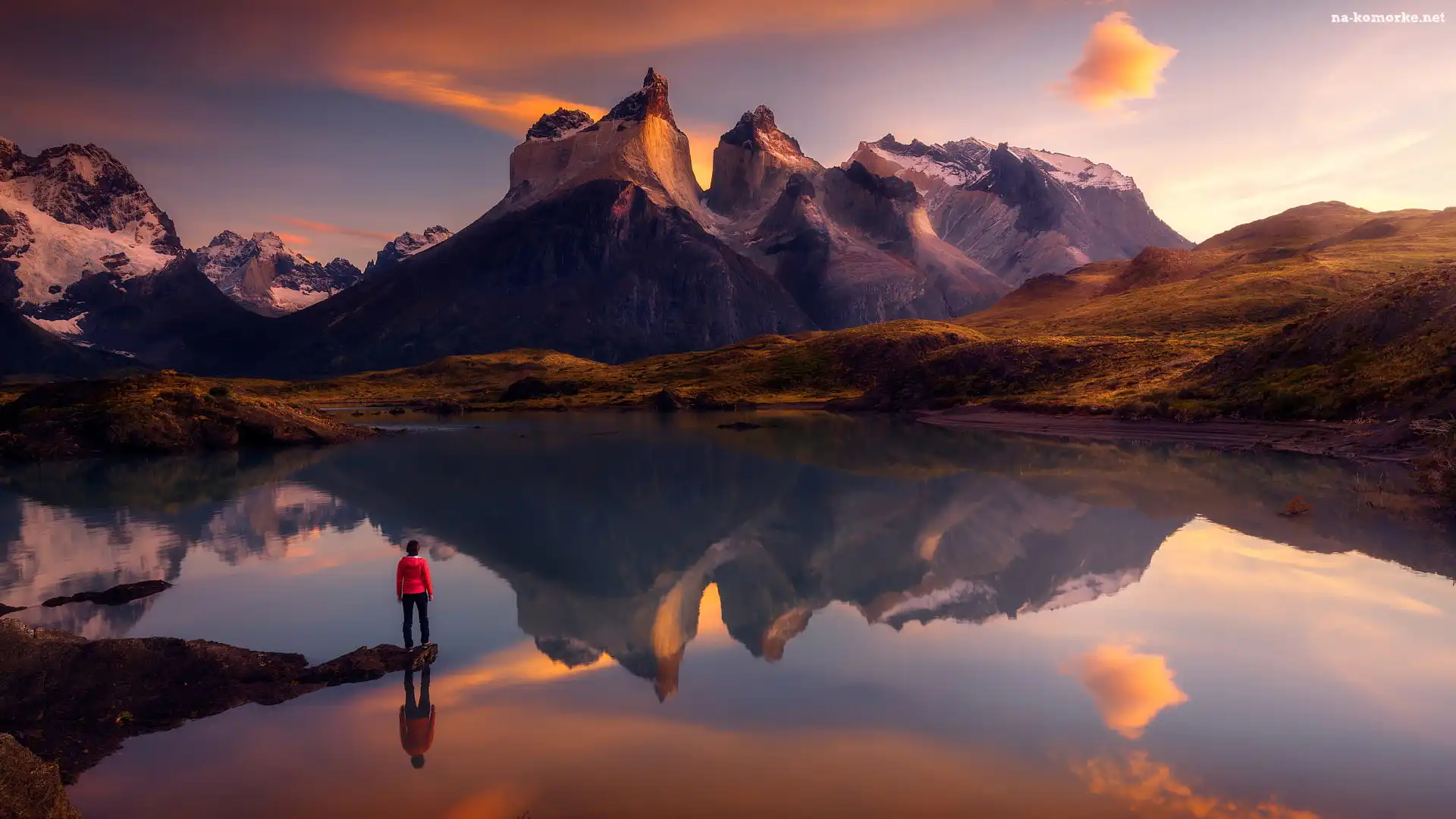 Park Narodowy Torres del Paine, Cordillera del Paine, Chile, Góry, Patagonia, Wschód słońca, Jezioro Pehoe, Masyw, Torres del Paine, Człowiek na Komórkę |
