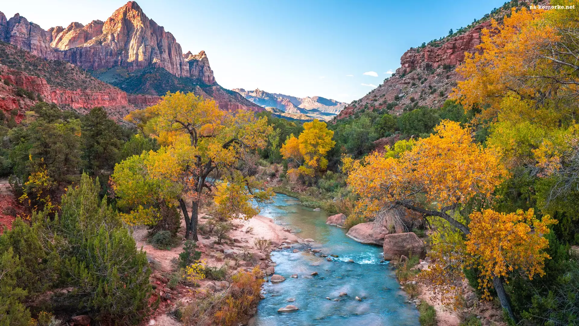 Stany Zjednoczone, Kamienie, Park Narodowy Zion, Drzewa, Stan Utah, Góry Watchman, Rzeka, Virgin River na Komórkę |