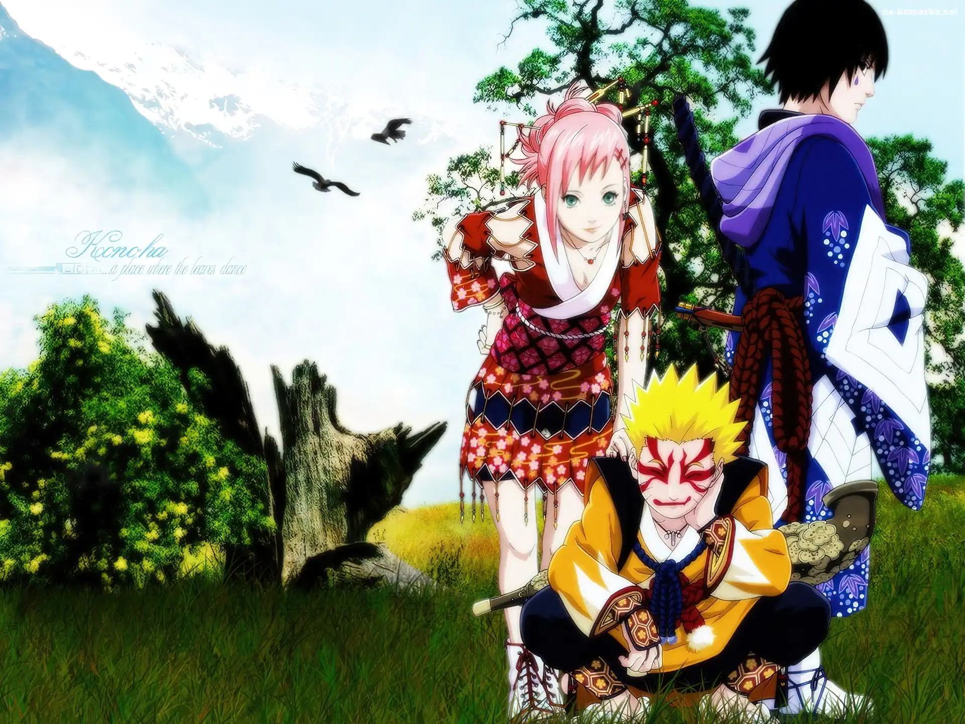 Naruto, drzewa, ludzie, ptaki na Komórkę