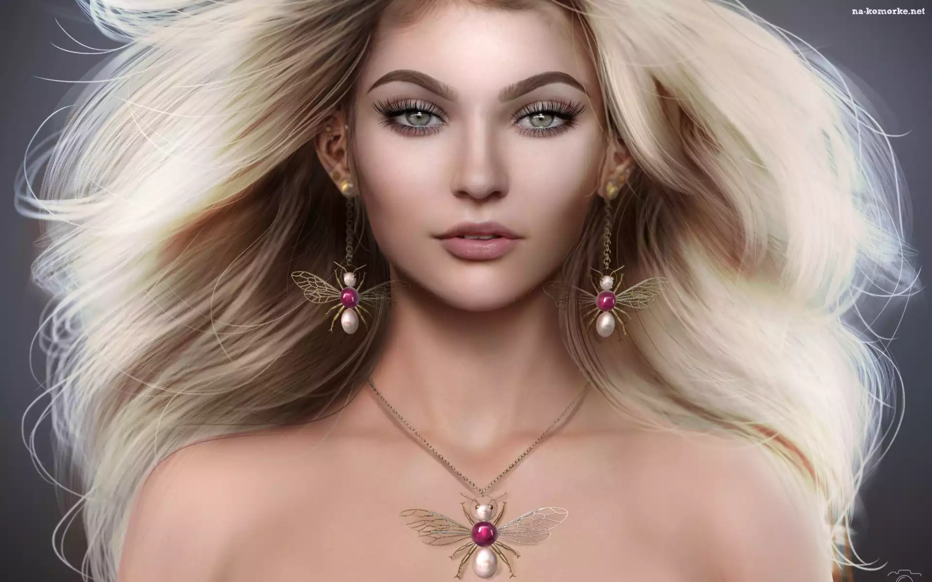 Naszyjnik, Blondynka, Kobieta, Grafika, Kolczyki, Motyl na Komórkę
