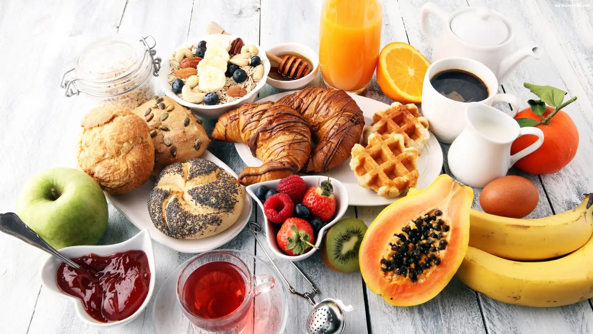 Śniadanie, Bułki, Rogale, Kawa, Sok, Owoce, Dżem na Komórkę