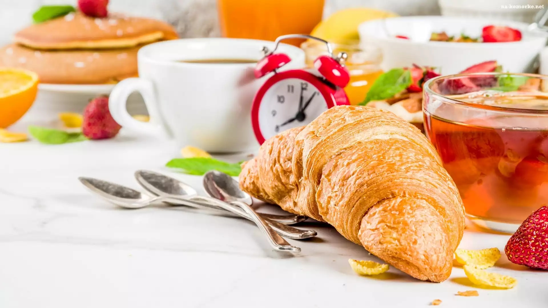 Śniadanie, Herbata, Budzik, Rogalik, Croissant, Sok, Kawa na Komórkę