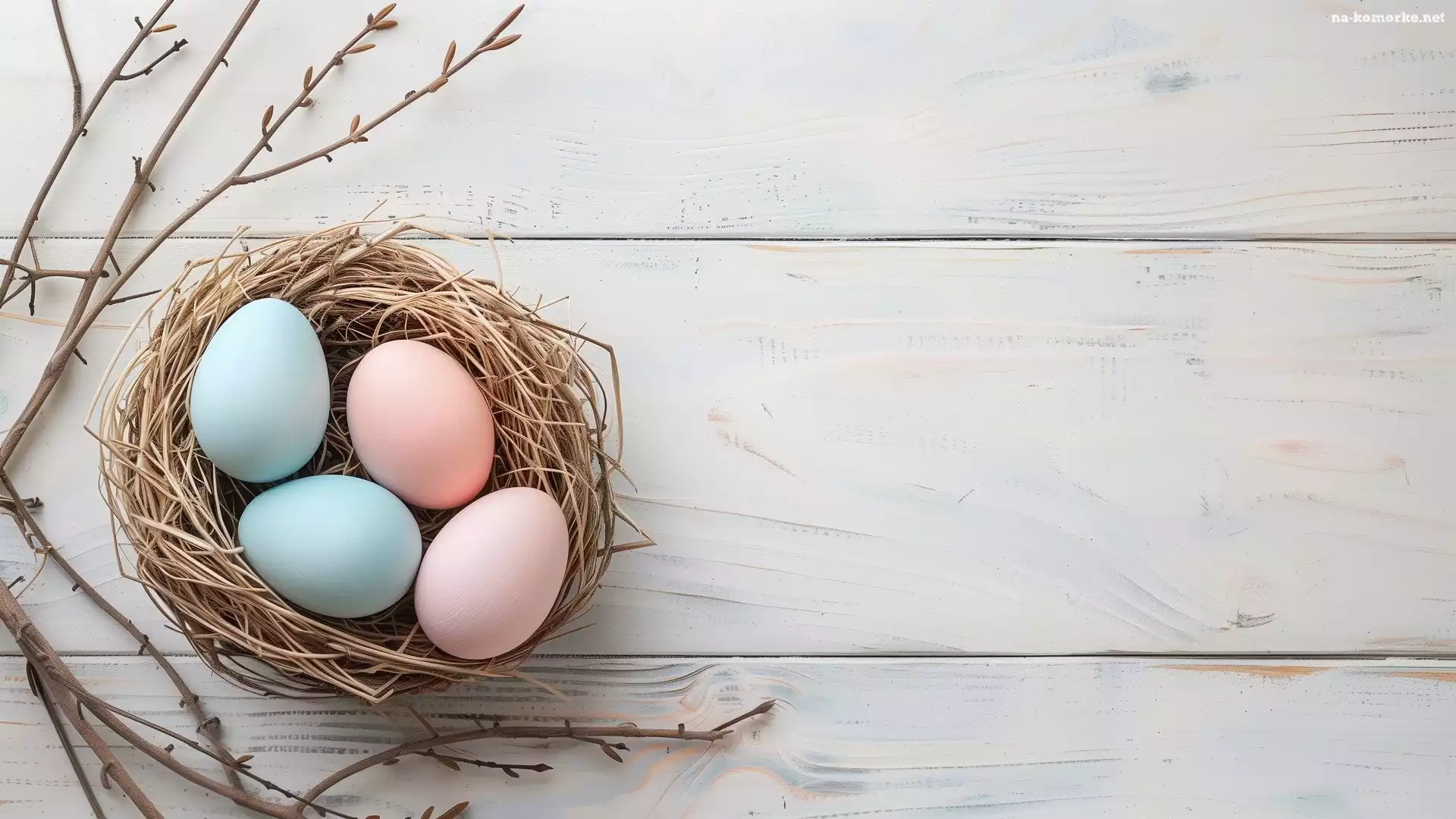 Różowe, Białe, Gniazdo, Wielkanoc, Gałązki, Deski, Pisanki, Niebieskie na Komórkę