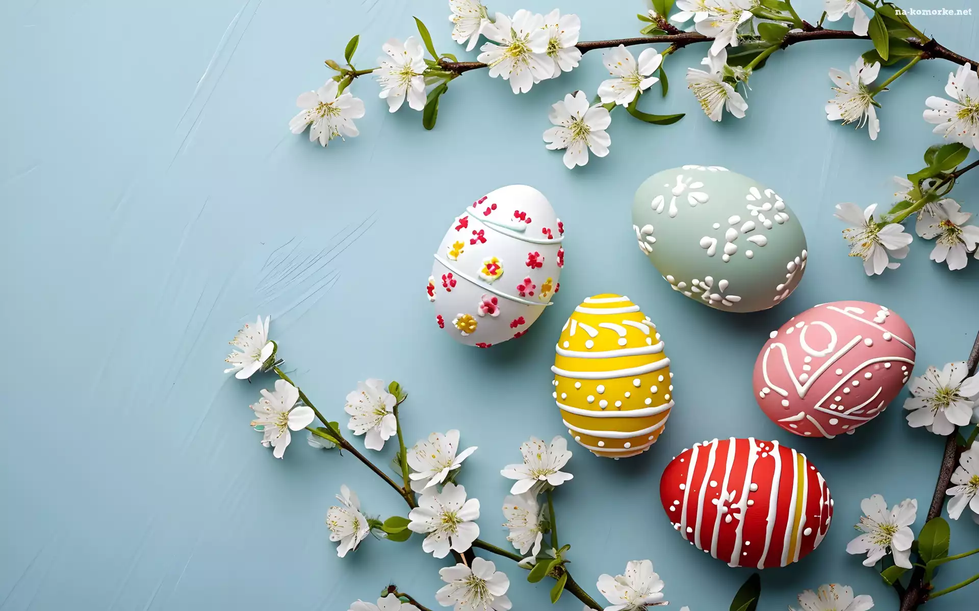 Niebieskie, Kwiaty, Wielkanoc, Białe, Gałązki, Pisanki, Kolorowe, Listki, Tło na Komórkę