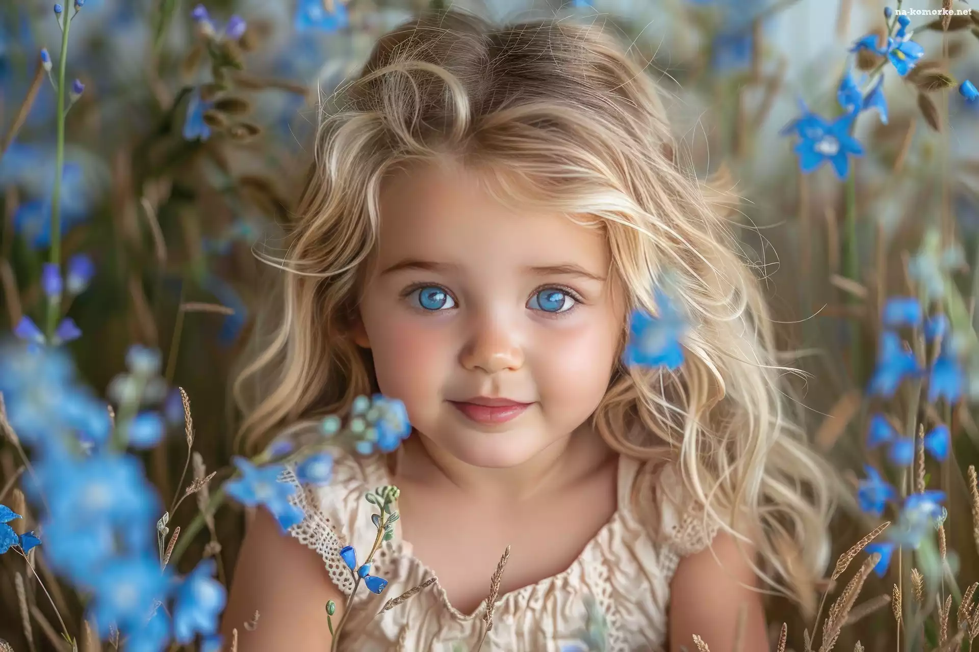 Dziewczynka, Niebieskie, Kwiaty, Oczy, AI na Komórkę