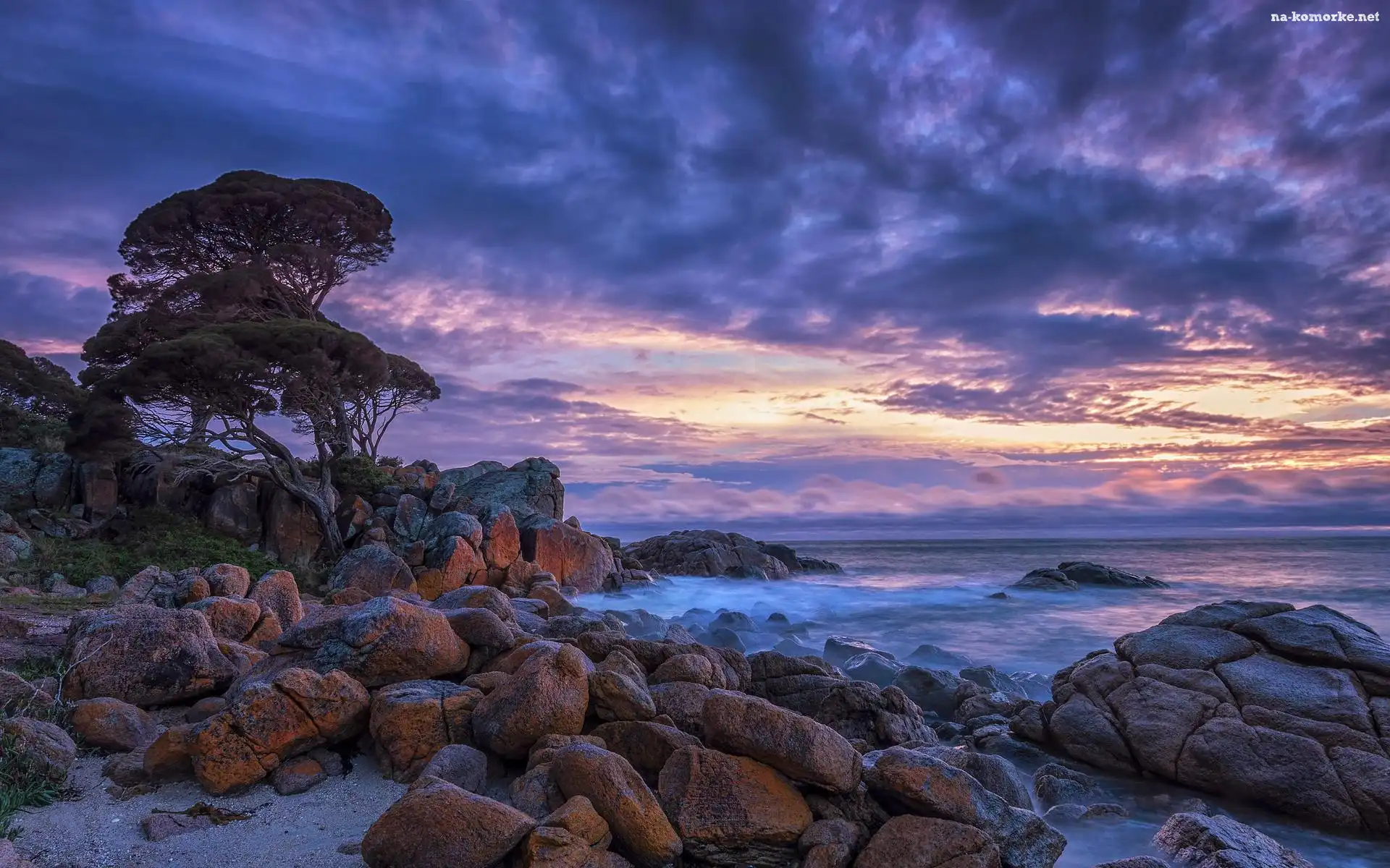 Skały, Wybrzeże, Drzewa, Kamienie, Australia, Shelley Cove, Chmury, Morze, Niebo na Komórkę