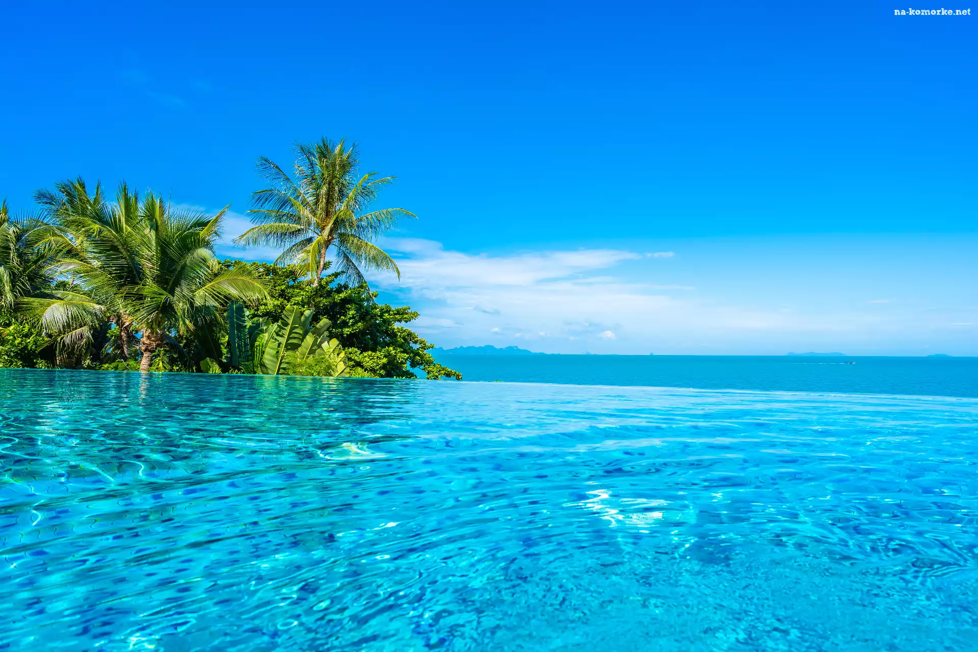 Palmy, Plenerowy, Drzewa, Niebo, Morze, Basen na Komórkę