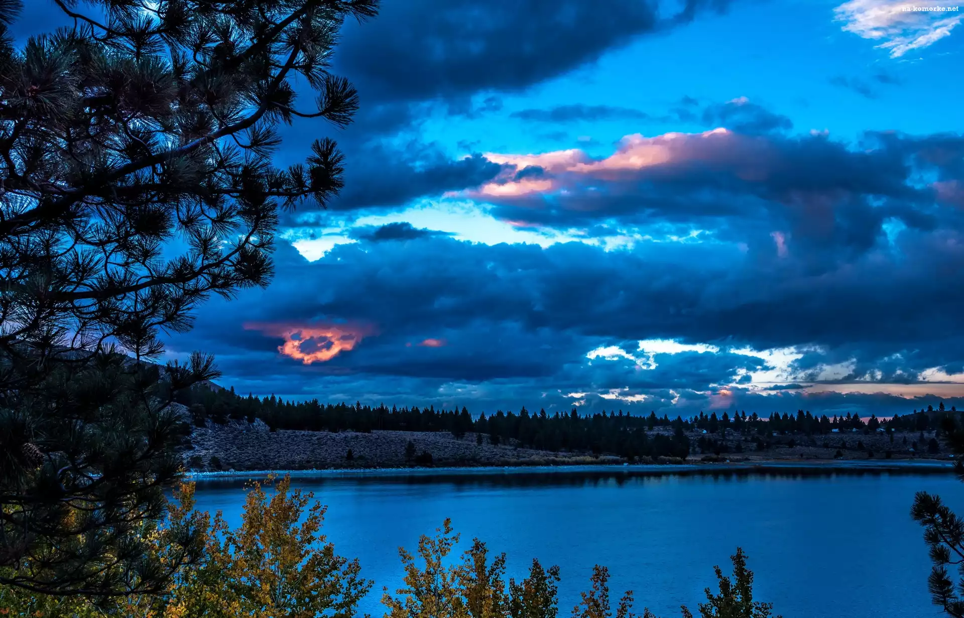 Niebo, Drzewa, Chmury, Rzeka na Komórkę