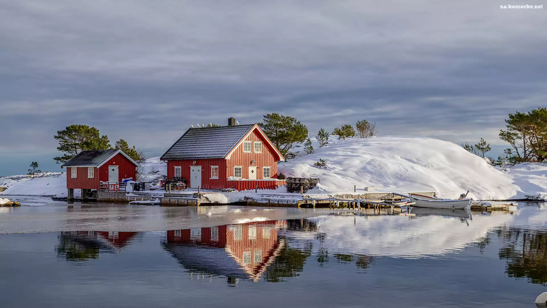 Śnieg, Zaspa, Czerwone, Niebo, Jezioro, Odbicie, Domy na Komórkę