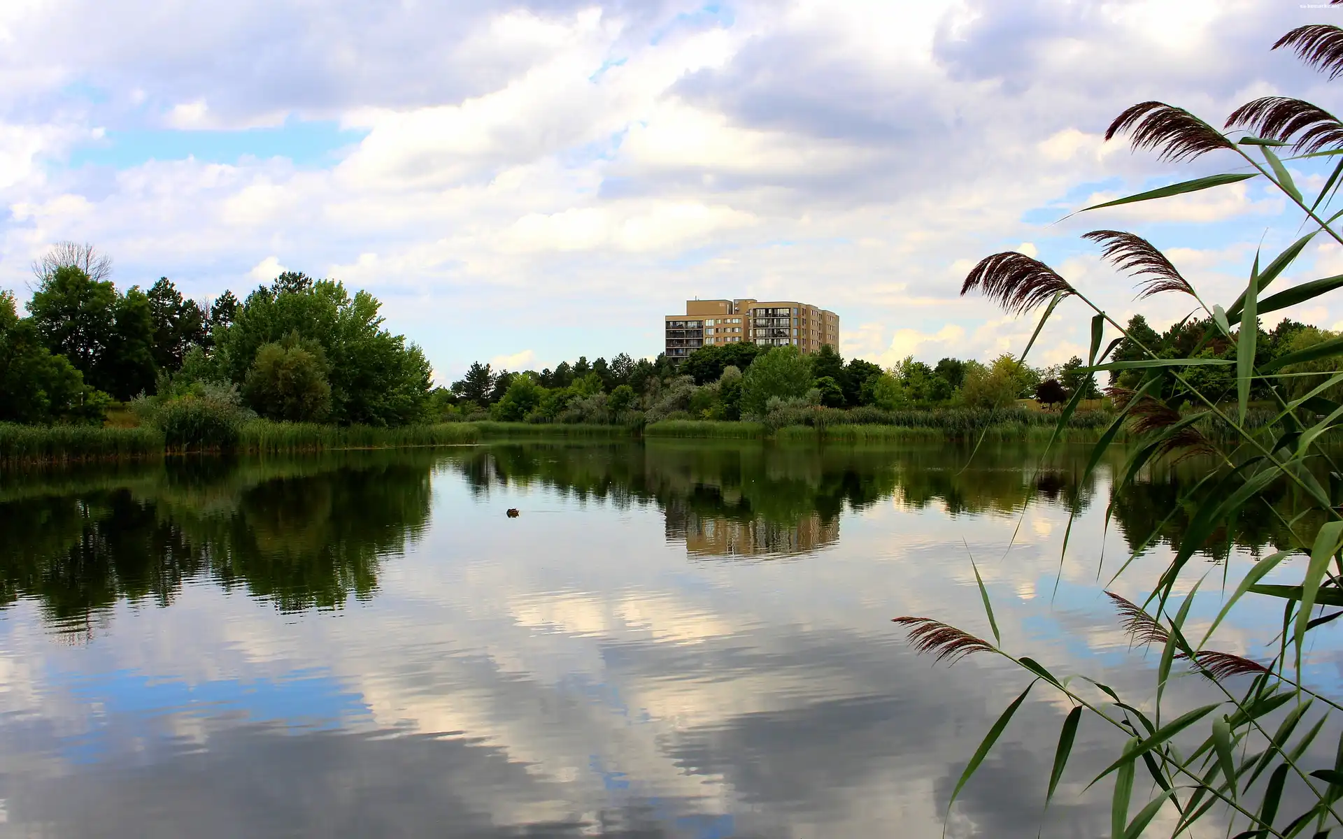 Niebo, Staw, Domy, Drzewa, Odbicie na Komórkę