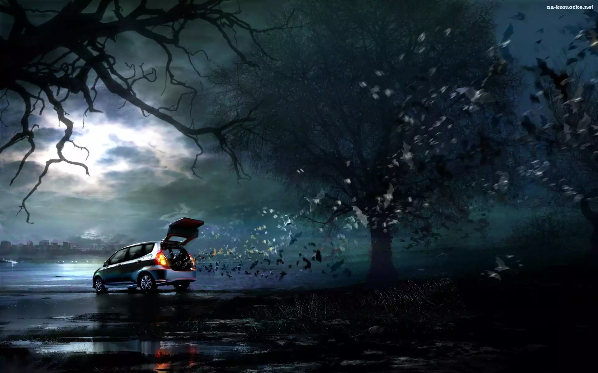 Niebo, Samochód, Nietoperze, Drzewa, Woda na Komórkę