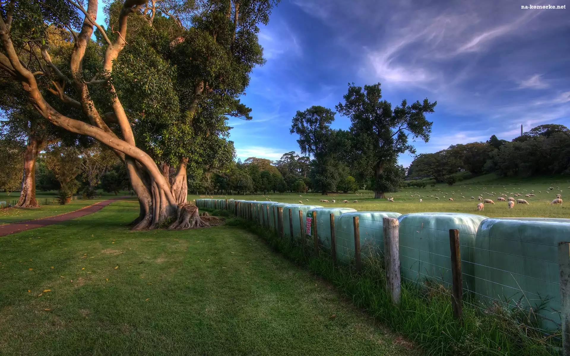 Niebo, Owce, Drzewa, Ogrodzenie na Komórkę