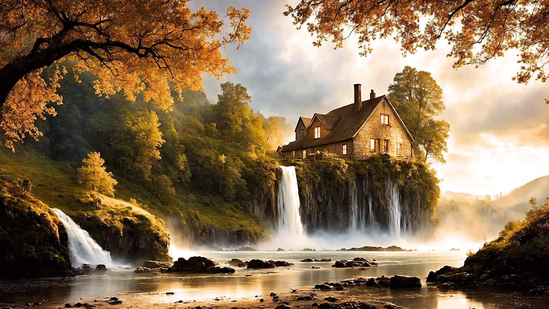 Niebo, Kamienie, Wzgórze, Rzeka, Las, Jesień, Wodospady, Dom, Drzewa, Chmury na Komórkę