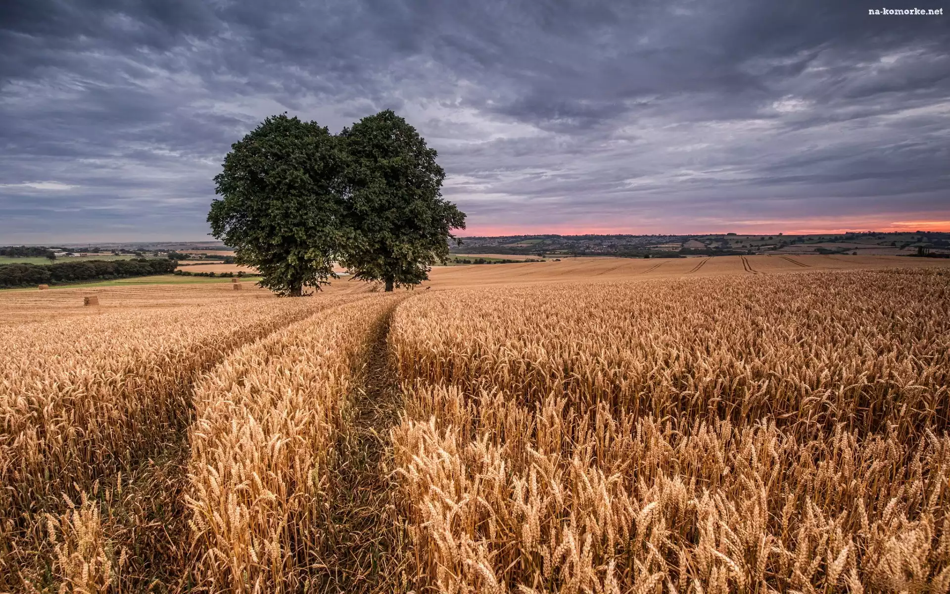 Niebo, Zboże, Pole, Słońca, Drzewo, Zachód na Komórkę